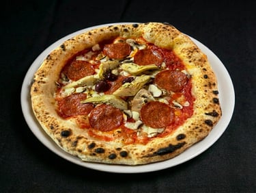 Pelat, Mozzarella Fior di Latte, gorgonzola, pikantna salama, kapari, tršćanski umak